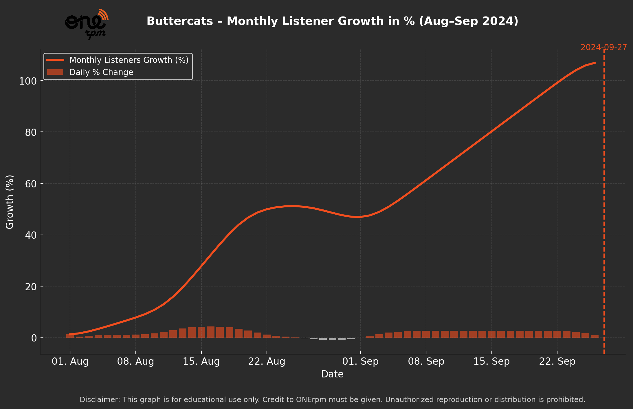 Between July 19 and October 14, Buttercats saw a remarkable 1,148% increase in their Spotify monthly listeners. During the same period, their Popularity Index jumped from 0 to 37, signaling the band's arrival on Spotify's algorithmic radar and enhancing their discoverability across platform-curated playlists.